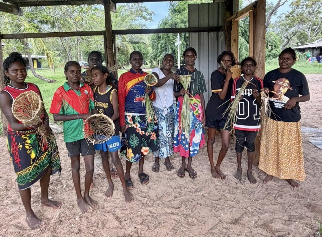 Milingimbi School female senior students learning the art of weaving a fish trap as a part of MOPRA’s Learning on Country program.